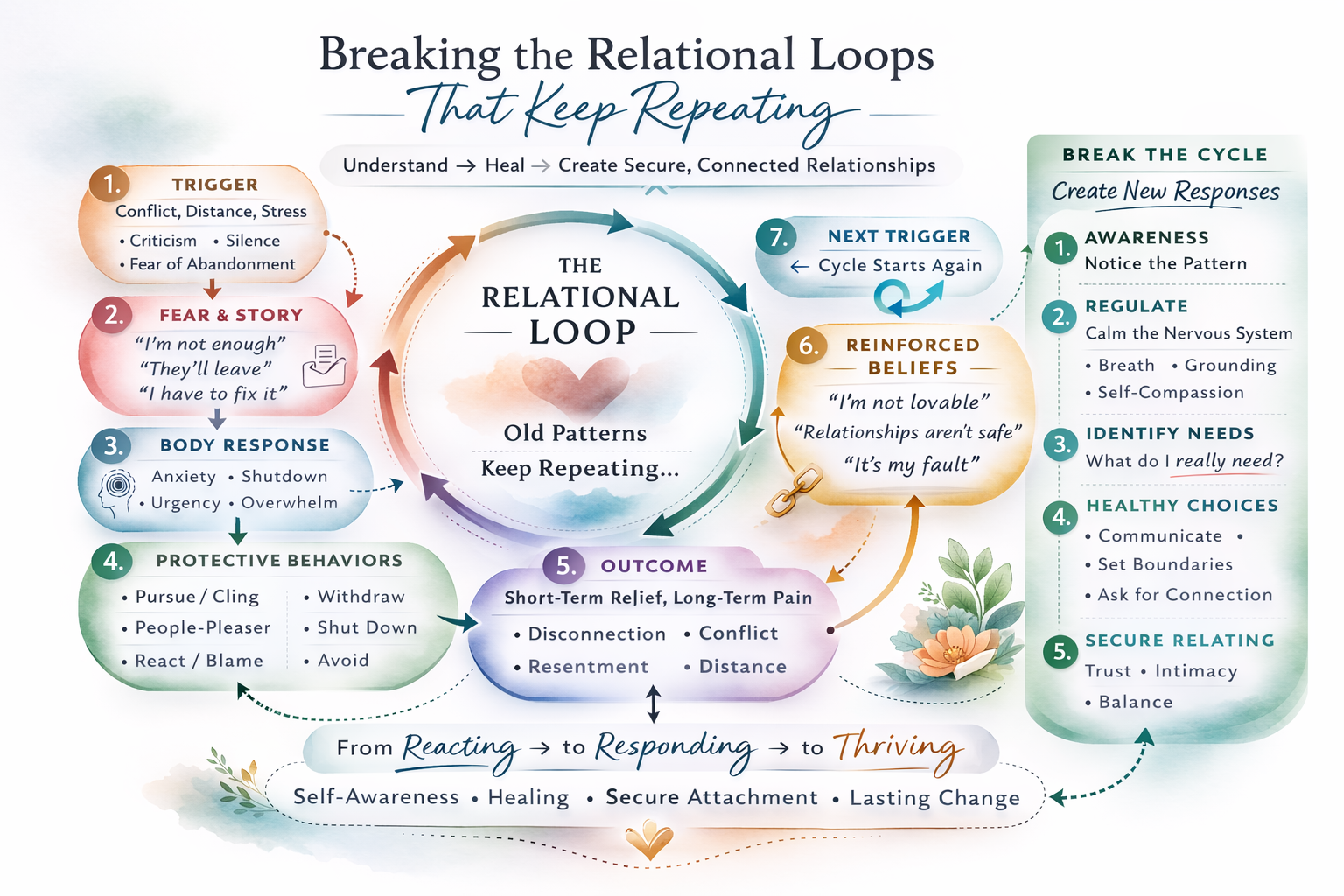 This often happens because of an attachment or anxiety loop. A moment of disconnection or conflict can trigger the nervous system, creating feelings of anxiety, fear, or emotional overwhelm. In response, people may react by seeking reassurance, shutting down, becoming defensive, or avoiding the situation altogether. While these responses are attempts to protect ourselves, they can unintentionally recreate the same relational tension — reinforcing the cycle.